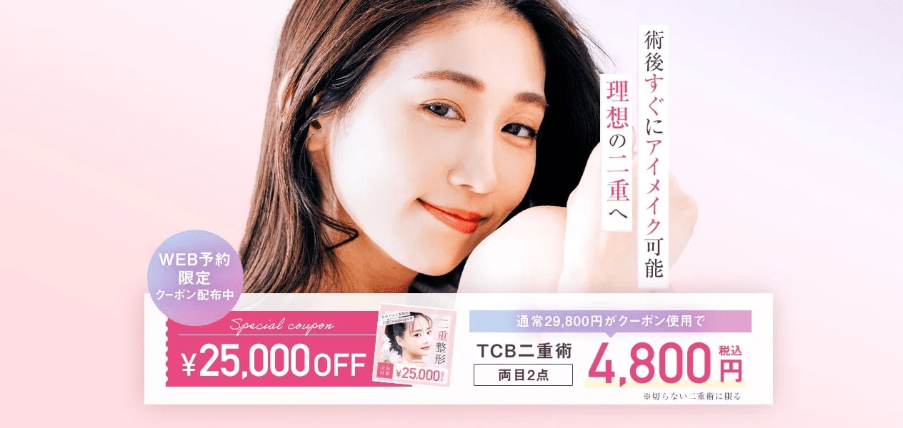 TCB東京中央美容外科の二重整形埋没法は保証付きで4,800円から可能で、業界最安値級レベルです。